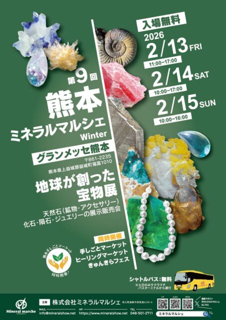 天然石や鉱物、アクセサリー、化石、隕石、ジュエリーを対象とした展示販売会です。鉱物愛好者の裾野を広げることを目的として開催され、どなたでも入場無料で来場できます。駅近の大型コンベンションホールを会場に、全国各地から出店者が集まり、幅広い価格帯の鉱物や宝石が展示販売されます。