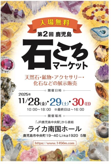 天然石や鉱物、アクセサリー、化石が揃う展示販売イベントで、多彩なアイテムをゆっくり見られる内容です。会場では個性豊かな石の魅力が広がり、じっくりお気に入りを探せる雰囲気が楽しめます。駅直結の利便性もあり、立ち寄りやすいロケーションで開催されます。