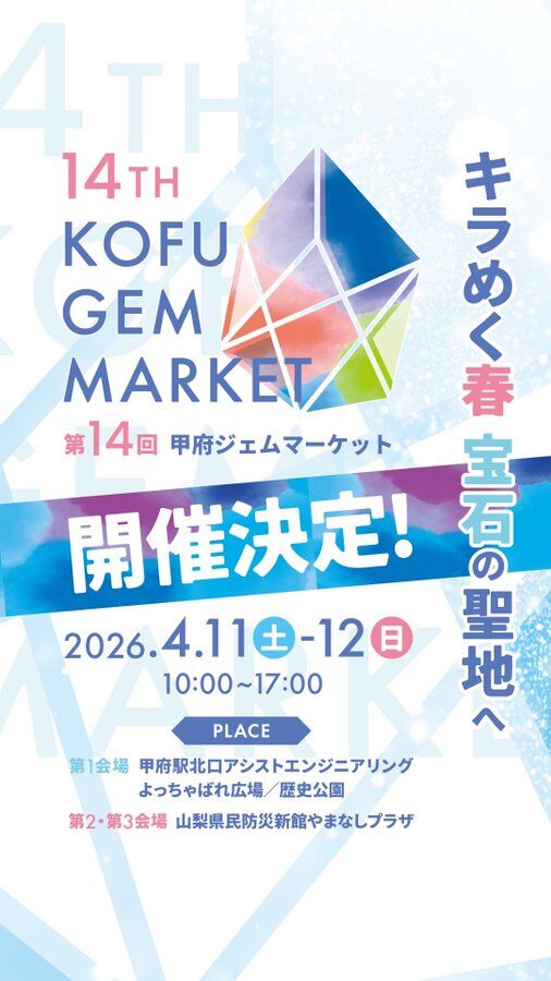 山梨県甲府市で4月に開催される宝石イベントとして、甲府駅北口アシストエンジニアリングよっちゃばれ広場/歴史公園と山梨県民防災新館やまなしプラザを会場に実施される第14回甲府ジェムマーケットは、鉱物、宝石や化石、ジュエリー産業に関連する体験を楽しめるイベントです。