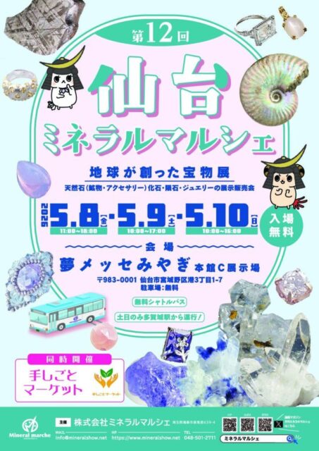 宮城で5月に開催される展示販売会として、夢メッセみやぎ 本館C展示場を会場に天然石(鉱物・アクセサリー)化石・隕石・ジュエリーの展示販売が行われる第12回仙台ミネラルマルシェは、入場無料で来場できるイベントです。